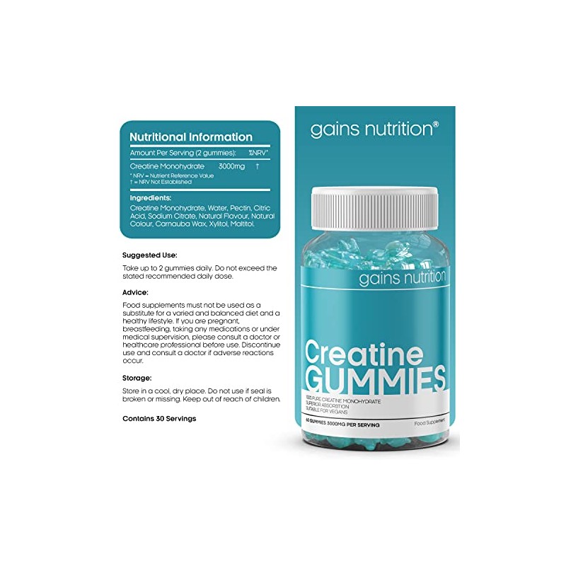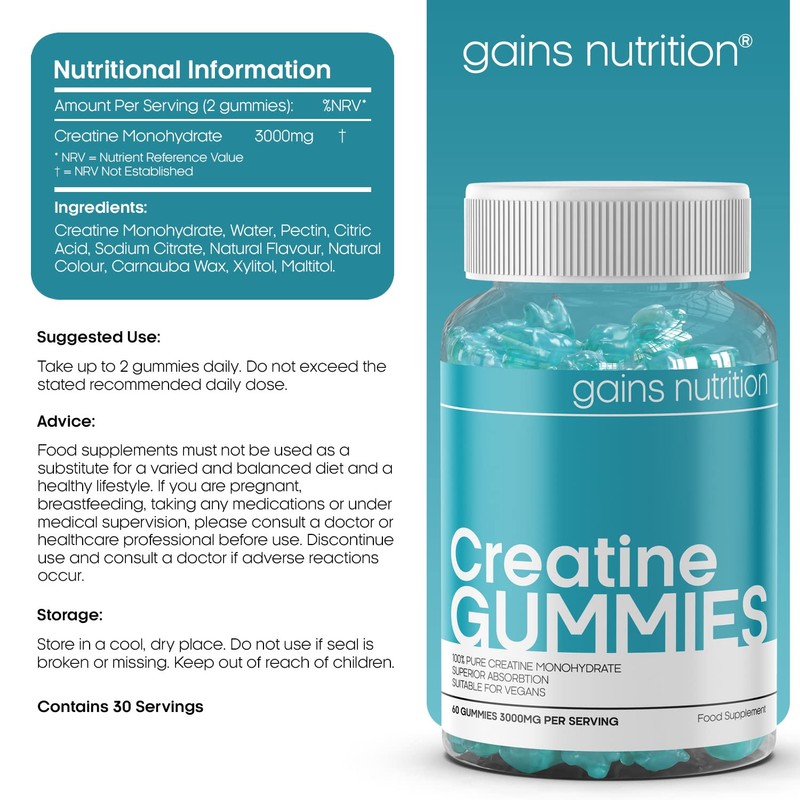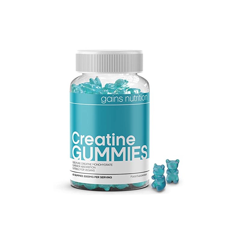 - Gains Nutrition has developed these tasty Creatine Gummies for fitness enthusiasts, bodybuilders and both male and female athletes. Our chewable Creatine Gummies come in natural berry flavour and offer 60 Gummies per bottle for a 30 day supply. Take 2 Creatine Gummies per day for a 3000mg serving of pure Creatine Monohydrate.