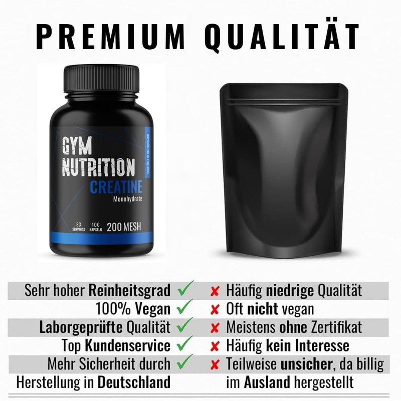 • Our creatine monohydrate capsules have a particularly high purity. The Gym Nutrition Creatine capsules can be swallowed perfectly unlike tablets.