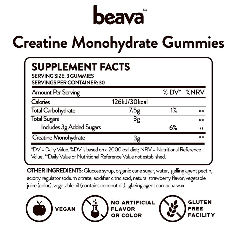 Our chewable creatine gummies are vegan, gluten-free, and made with natural strawberry flavor—no artificial colors or flavors. A supplement you can trust!