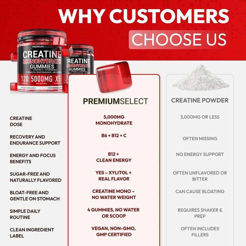 - TASTY & SUGAR FREE - Enjoy the benefits of delicious strawberry creatine flavor sugar free gummies. Increase your muscle strength and body with our pre workout vegan creatine gummies.