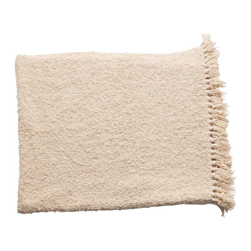 - This cotton blend boucle throw looks great resting on couches and chairs, and features a beautiful cream color with fringe detailing
