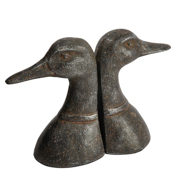 - Add some lodge-inspired charm and character to the bookshelf with these distressed black cast metal duck head bookends