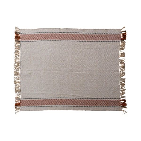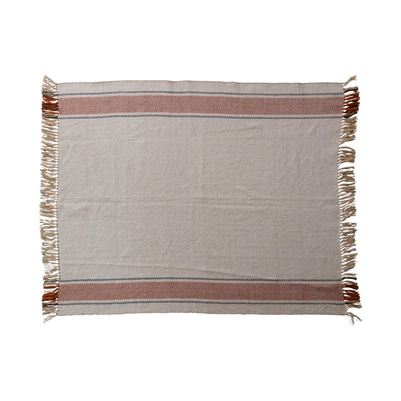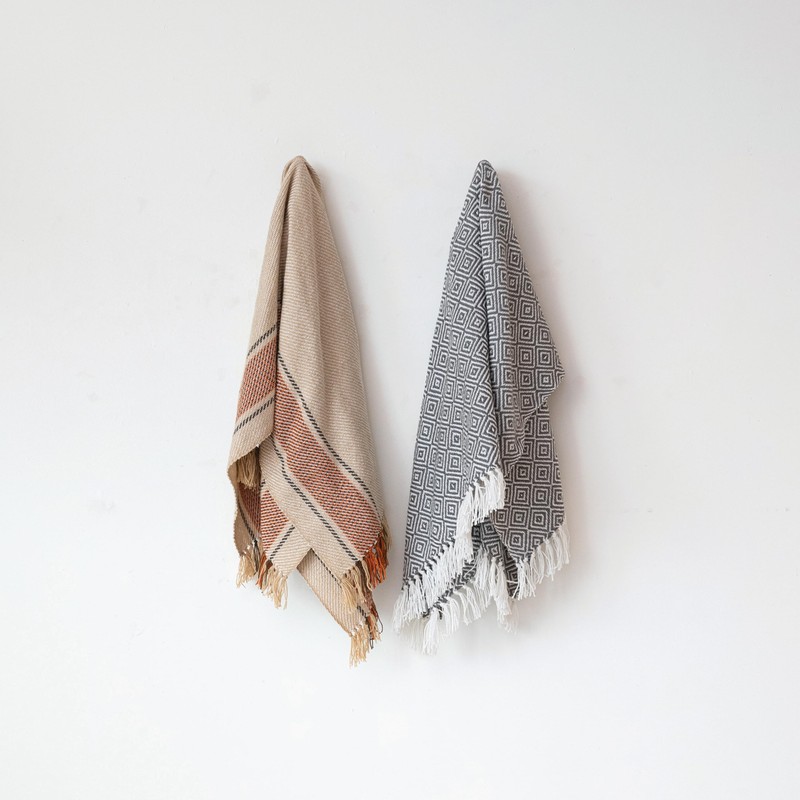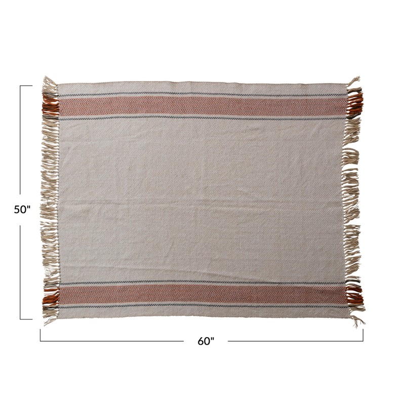 - A cozy and colorful throw blanket that features a hand-woven reclaimed fabric material and a fringe trim