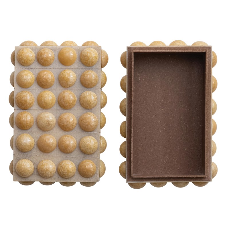 • A handcrafted rectangular box with soft cream marbled resin and warm wood accents