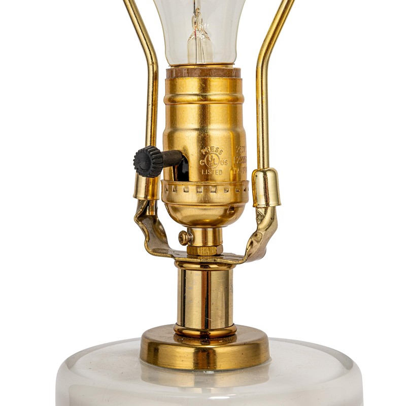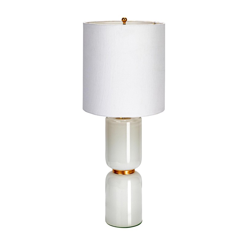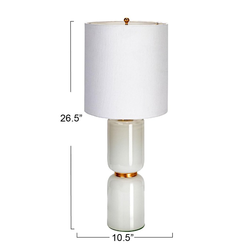- This masterfully crafted table lamp showcases a sleek sculptural glass base accented with a contrasting gold band and topped with a cotton drum shade