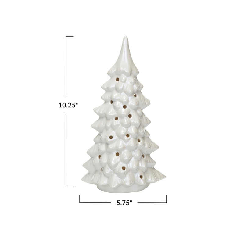 - A lovely and luminous cream stoneware LED tree with cut-outs and iridescent finish
