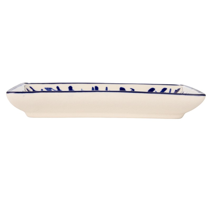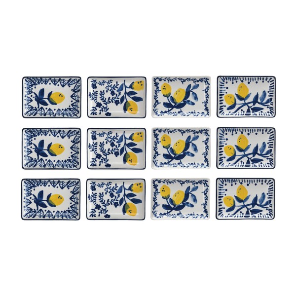 - A set of 12 rectangular stoneware plates with a lemon design and a blue rim, available in four styles