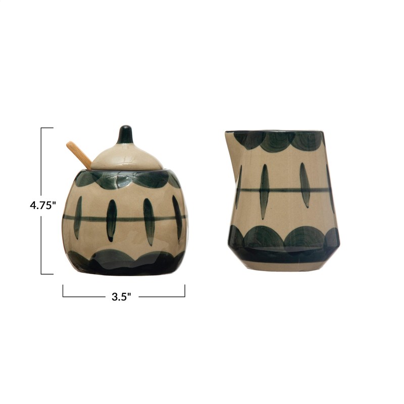 - This farmhouse-inspired stoneware creamer and sugar pot set features intricately hand-painted designs and a bamboo spoon