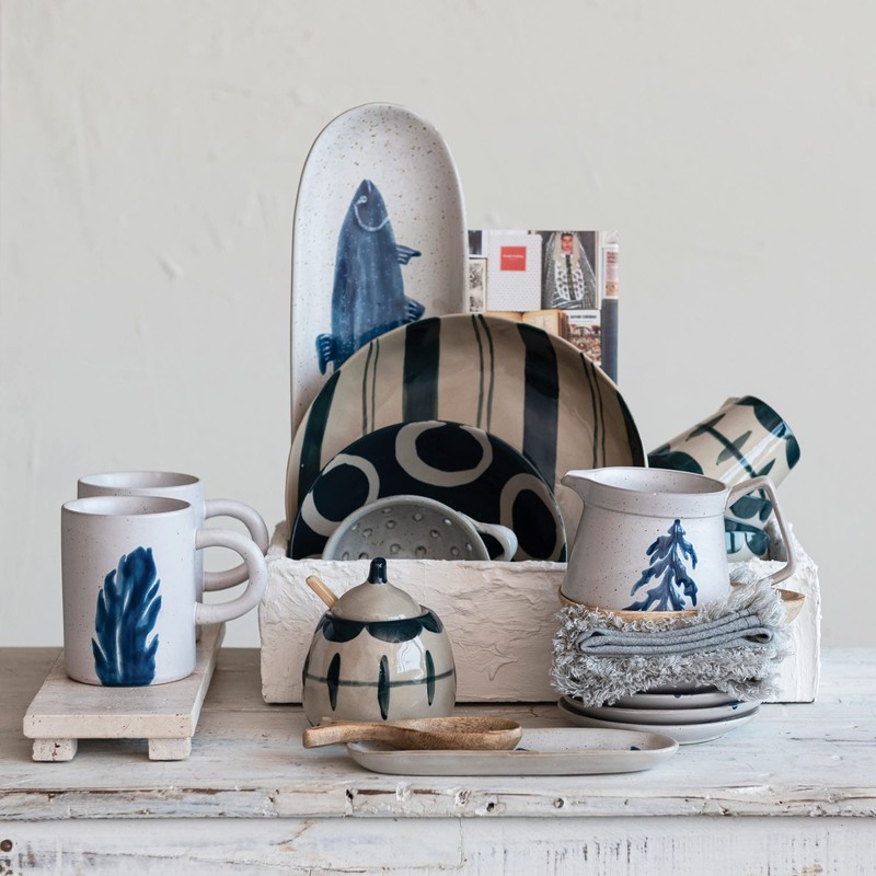 Creative Co-Op Stoneware Pot with Painted Designs and Bamboo Spoon, Midnight Blue and Cream, Set of 3 Pieces Sugar and Creamer