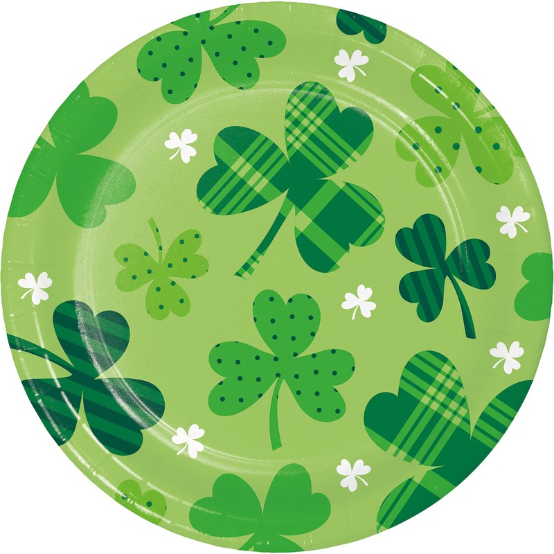 - Our disposable paper tableware features a playful shamrock design in green hues