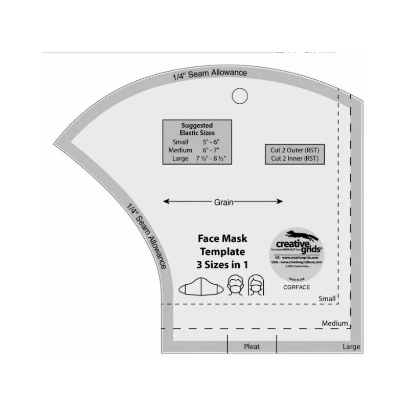 The Face Mask Template is a 3-in-1 template that makes a small, medium, or large sized mask. An instruction guide is included with the template. The Face Mask Template is a fast way to cut out shaped double layered face masks. Simply stack 2 coordinating fabric pieces; two times; (with right sides together) and cut around the template with a rotary cutter. We find that a 28mm cutter works best around the curves.