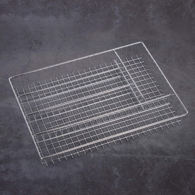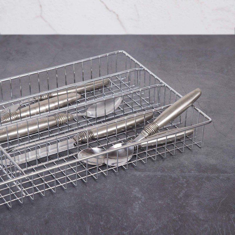 This Chrome Wire Cutlery Tray is a classic kitchen organizer. It is the ultimate in space-efficiency, taking up no counter space and fitting conveniently in your drawer. The beautiful chrome finish works well with any home decor themes of any type. Use this medium size tray to put your serving pieces or utensils in. Perfect for storing kitchen flatware and other utensils and gadgets. Features 5 sections to hold multiple sets of silverware and other kitchen accessories. Sturdy steel construction with elegant chrome finished.