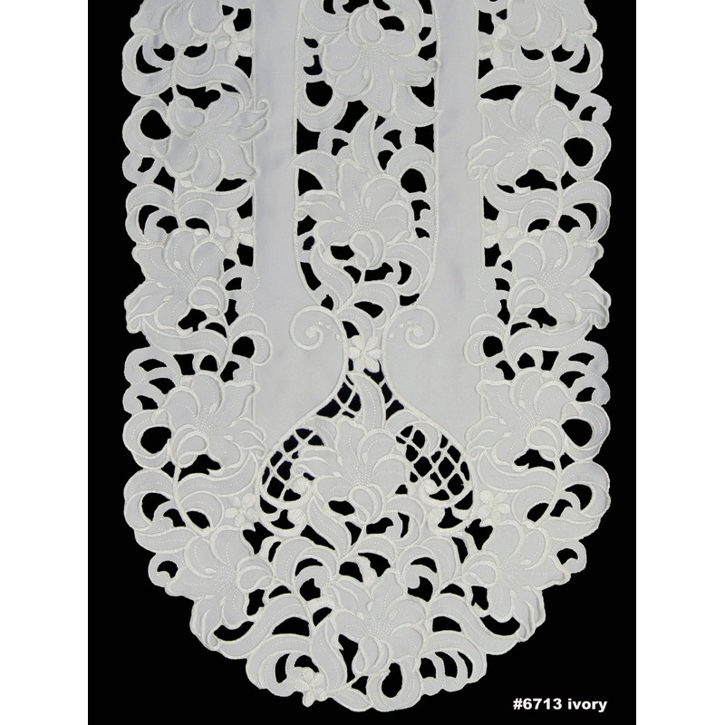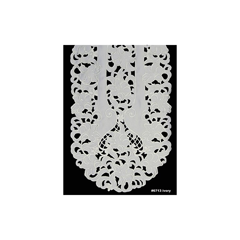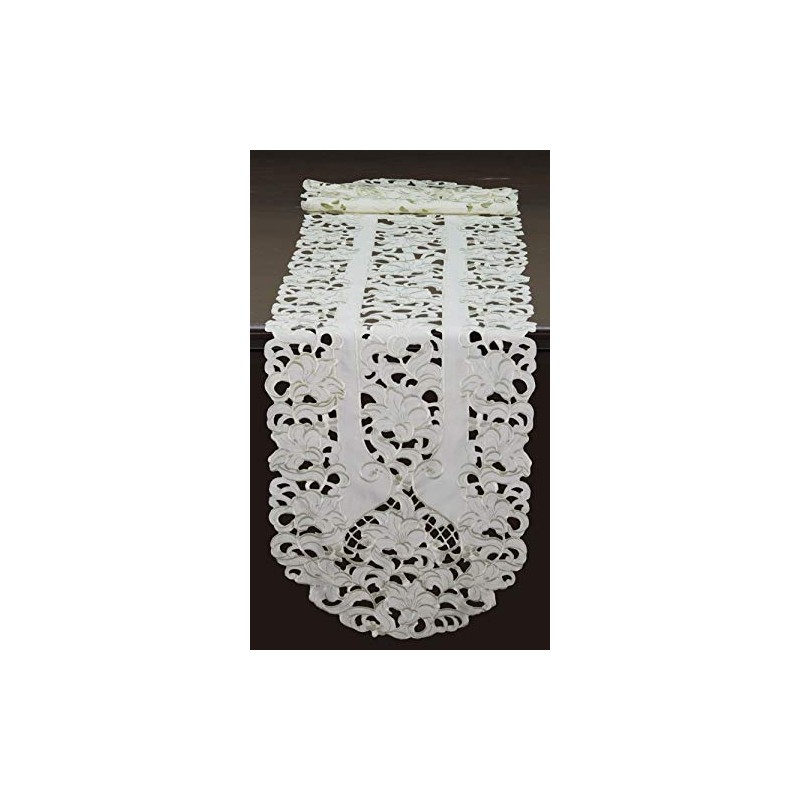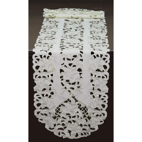 This beautiful Embroidered Floral Table Runner has an ivory background with embroidered lily, daisy flowers and leaves scattered on it. It also features elegant die-cut cutworks on it. The embroidery is in ivory color. It's perfect for holidays and special events - Valentine's Day, Easter, Mother's Day, Father's Day, Halloween, Thanksgiving, Christmas, New Year, Anniversary, Birthday or Wedding, etc. and everyday use. Imported. 100% polyester. Machine care.