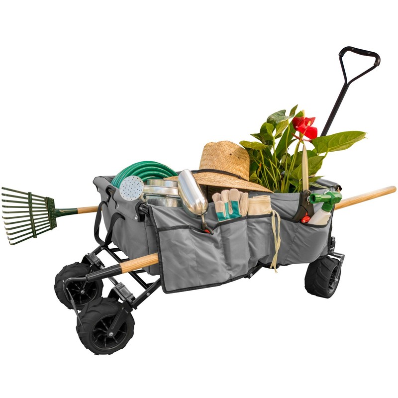 - Expandable utility wagon, fold with one pull on the toggle, extra wide adjustable all-terrain rubber wheels, loopholes (from fishing rods to tennis racquets), two front pockets, six pockets along with flaps to hold gardening tools, drink holds, pockets for phones and keys.