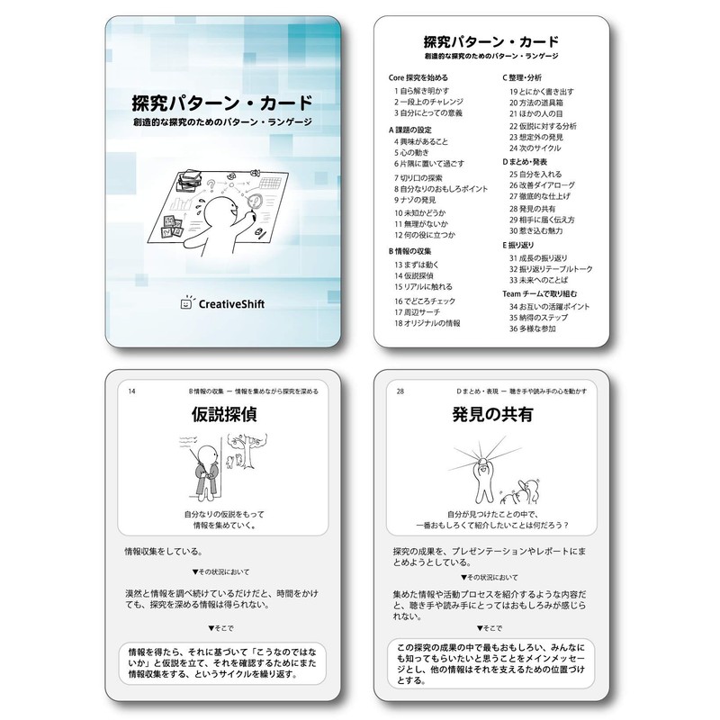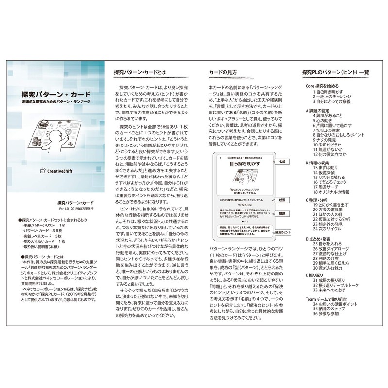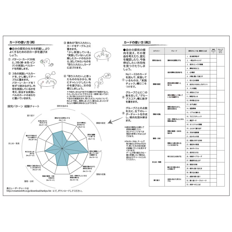 The Exploration Pattern Card is a card with thoughts (hints) for better exploration. Use the cards to help you develop exploration by thinking yourself, analyzing the status quo or discussing with everyone. Use these cards to turn back and think of a better way to progress through exploration activities and help you achieve effective learning by allowing you to focus on the essence of exploration.