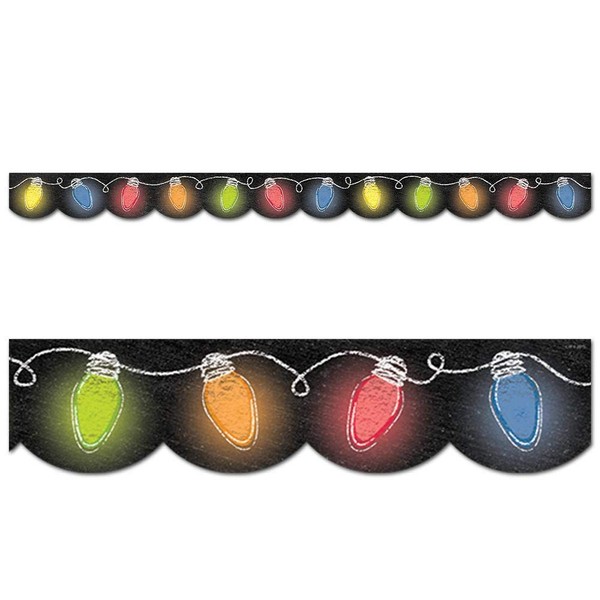 Add pizzazz to bulletin boards, doors, and common areas with our colorful Holiday Lights border. This border features a string of festive, glowing, chalk lights that is perfect for holiday and seasonal decorating. Great for Christmas parties and displays.2.75" wide35 feet per package Coordinates with other Chalk It Up! products. Borders are not just for bulletin boards, use these as edger's and trimmers to add style and organization to your designer classroom.