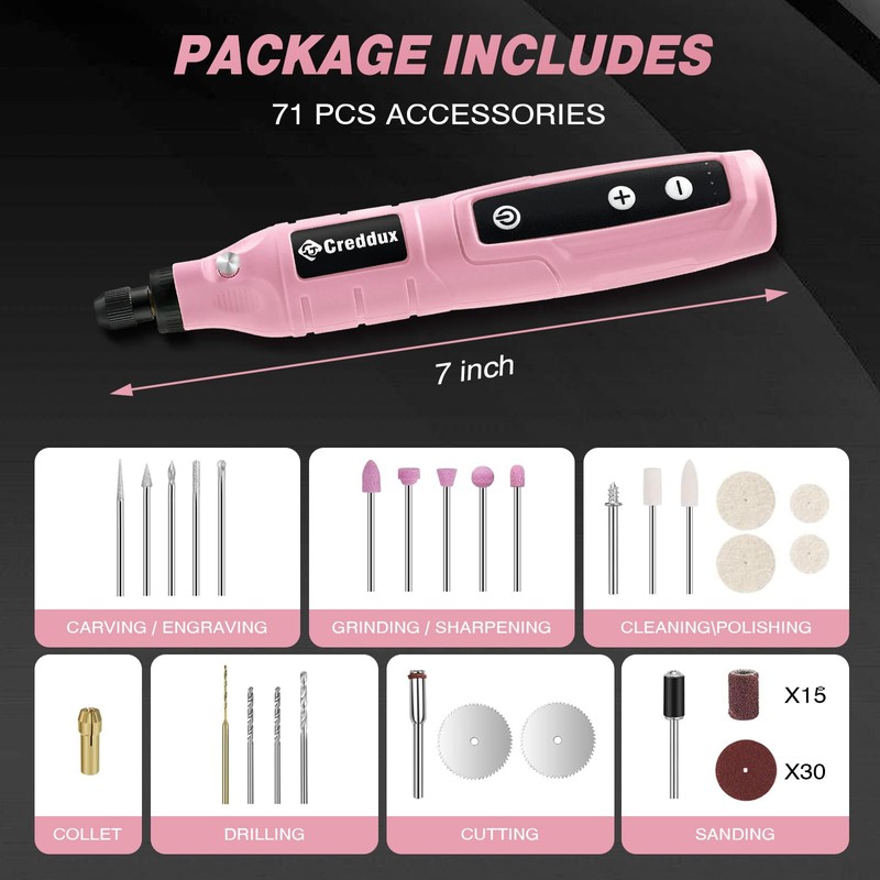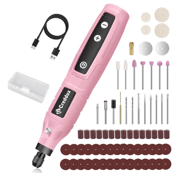 Creddux Cordless Rotary Tool,5 Speed Rotary Tool Kit With 71 Accessories,USB Charging,Multi-Purpose 4.2v Power Rotary Tools Easy Accessory Changes - Sanding, Polishing, Engraving and Cutting Pink