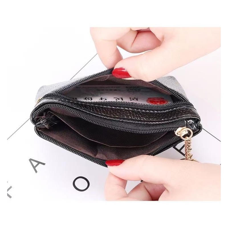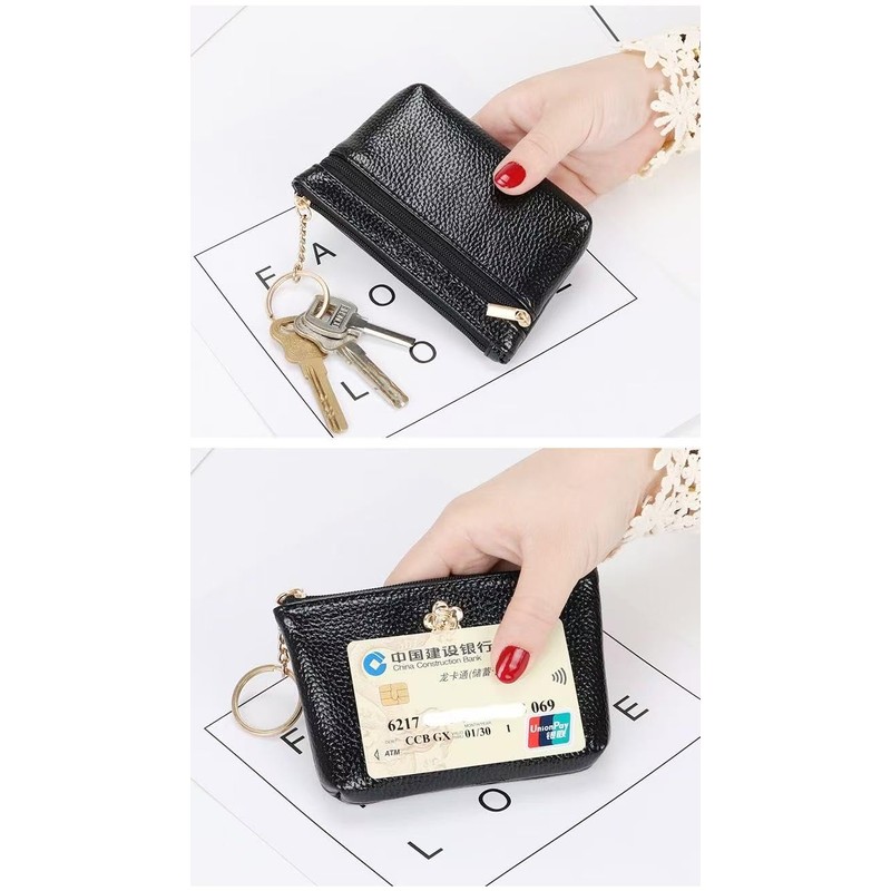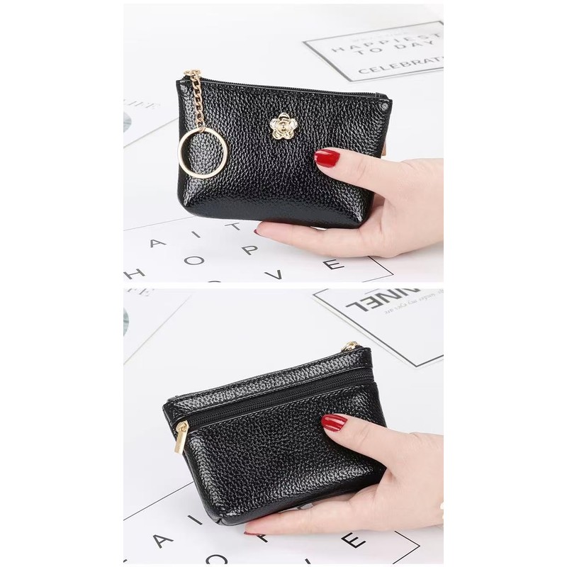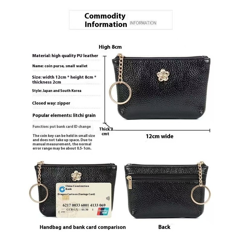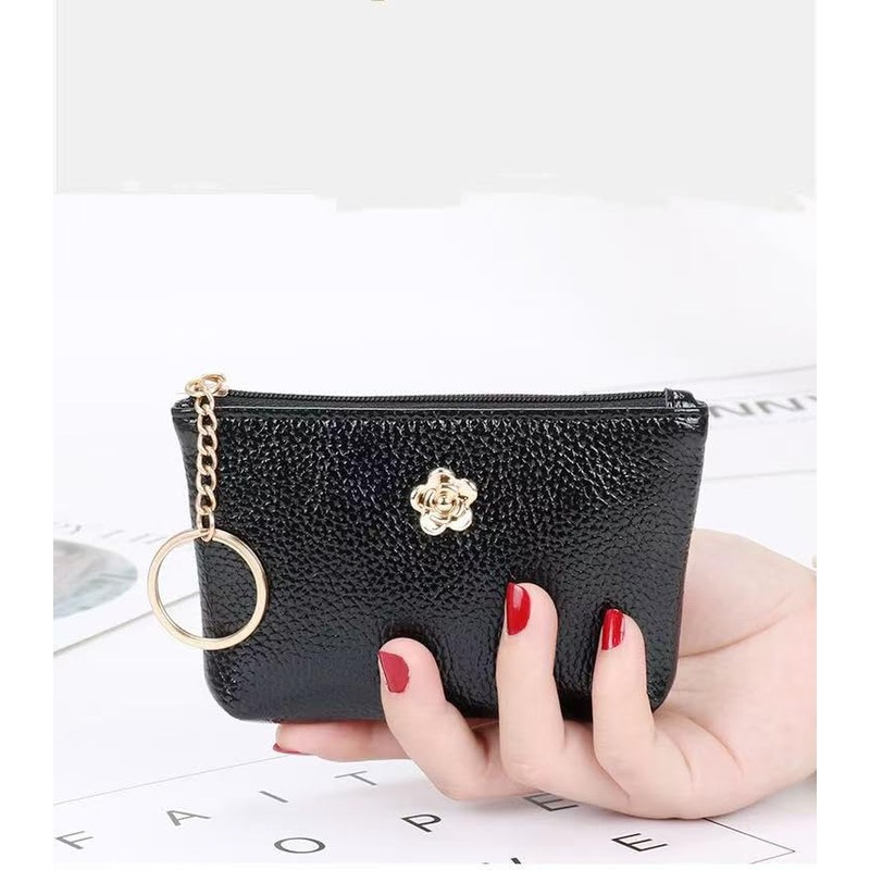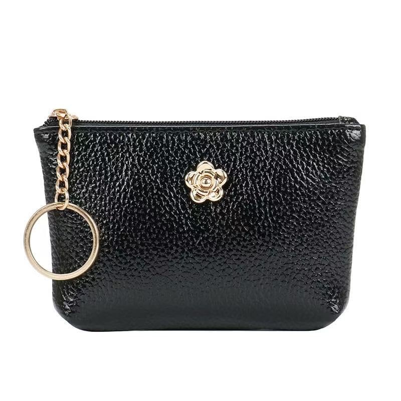 Exquisite and Versatile Coin Purse, a Stylish and Portable Delight This coin purse is made of high - quality black faux leather, with a delicate texture. It's not only durable but also exudes a sense of elegance. The zipper - closure design ensures security against theft, and makes it quick and easy to access your items. The unique metal flower decoration is exquisite and eye - catching, adding charm to the overall look. It also comes with a metal key ring, allowing you to attach keys and other small items, which is highly practical. Small and lightweight, it fits perfectly into your bag or can be held in your hand. It's an excellent choice for organizing change and cards during daily outings.