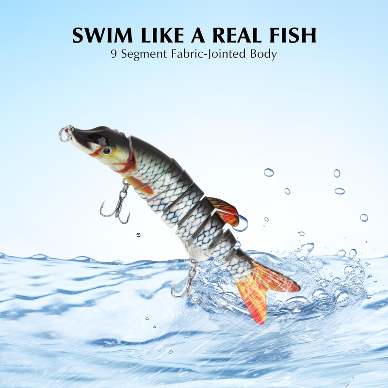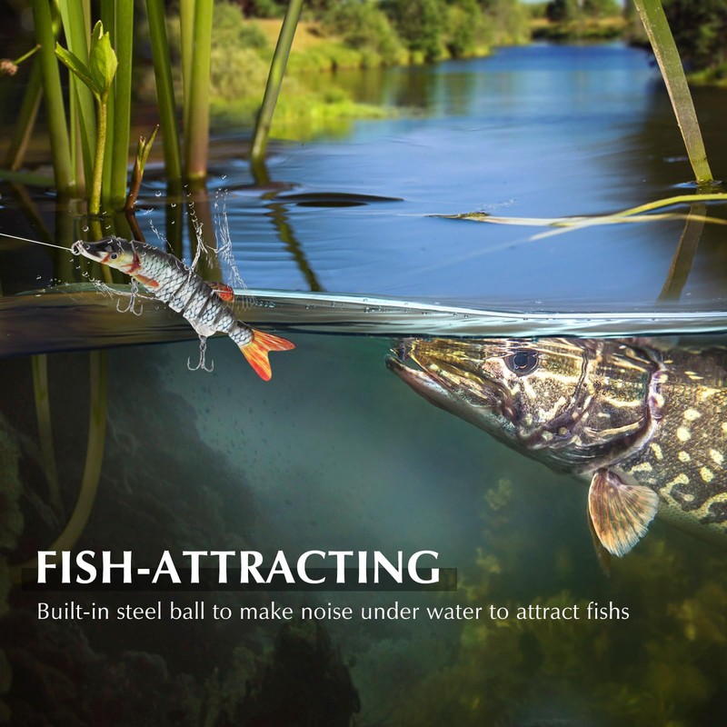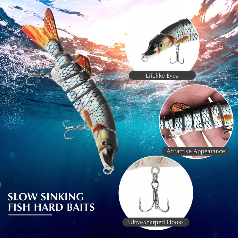 - Lifelike 9 Segment Bait - This fishing lure set with 9 segments and multiple joints can sink slowly and move flexibly in the water. In addition, lifelike swimming actions ensure that it attracts more catches and provokes predatory fish to bite