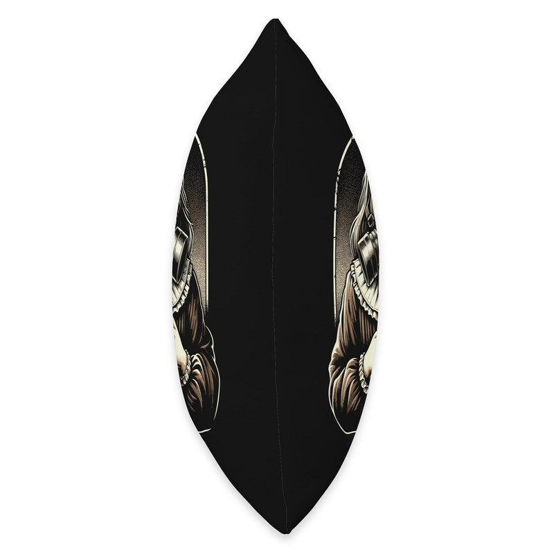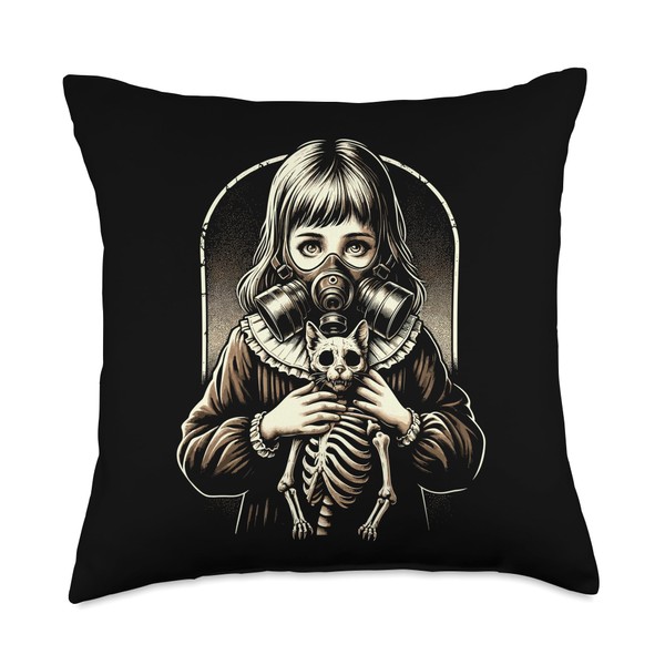 Creepy Girl Wearing Gas Mask and Holding a Cat Skeleton Throw Pillow