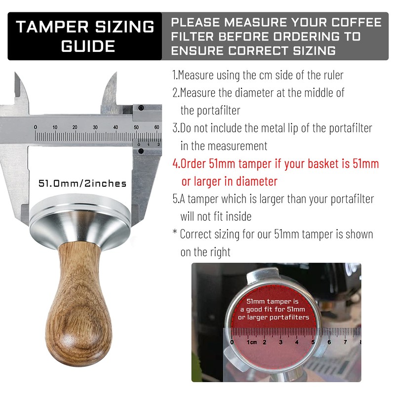 - 51mm Tamper: It fits most coffee machines like Delonghi. Please check your coffee portafilter basket dimensions carefully and ensure the size is 51mm or larger than 51mm.