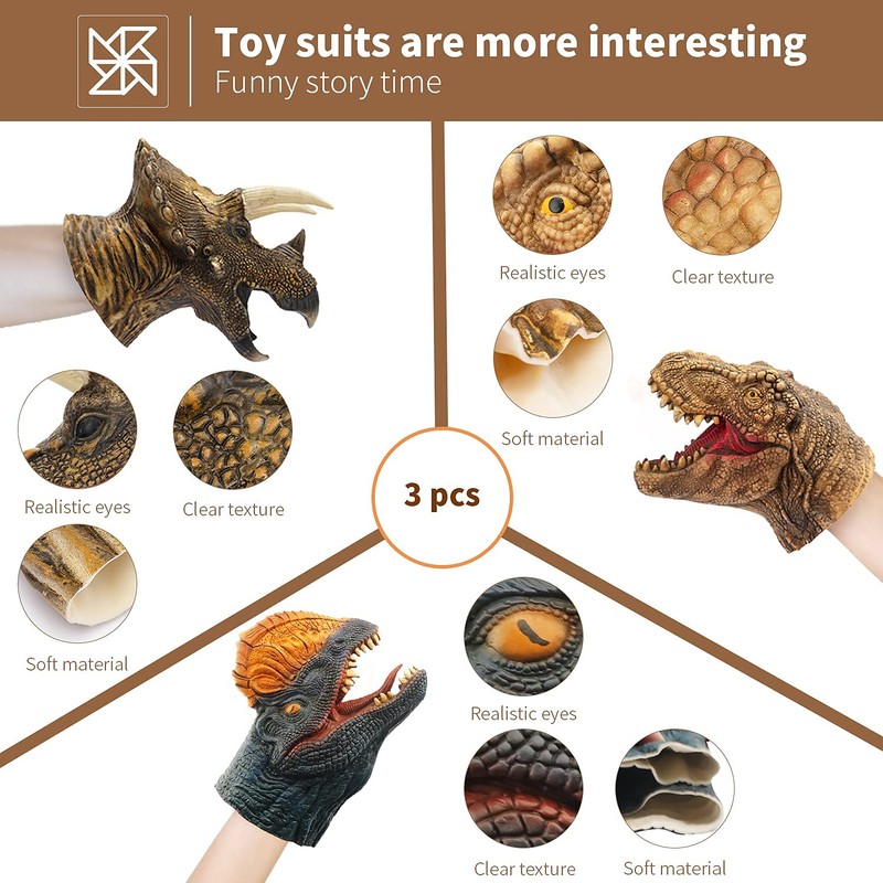 CreepyParty Dinosaur Hand Puppets Dino Toys Latex Raptor Realistic Puppet Soft Animal Head Rubber Toy Set T rex Puppet Tyrannosaurus Dilophosaurus Triceratops Pack of 3