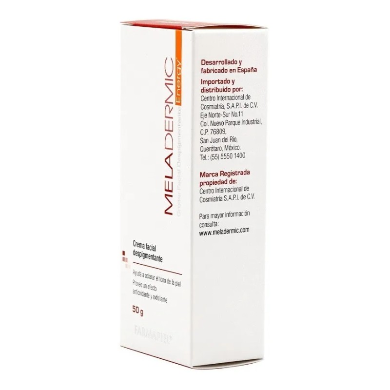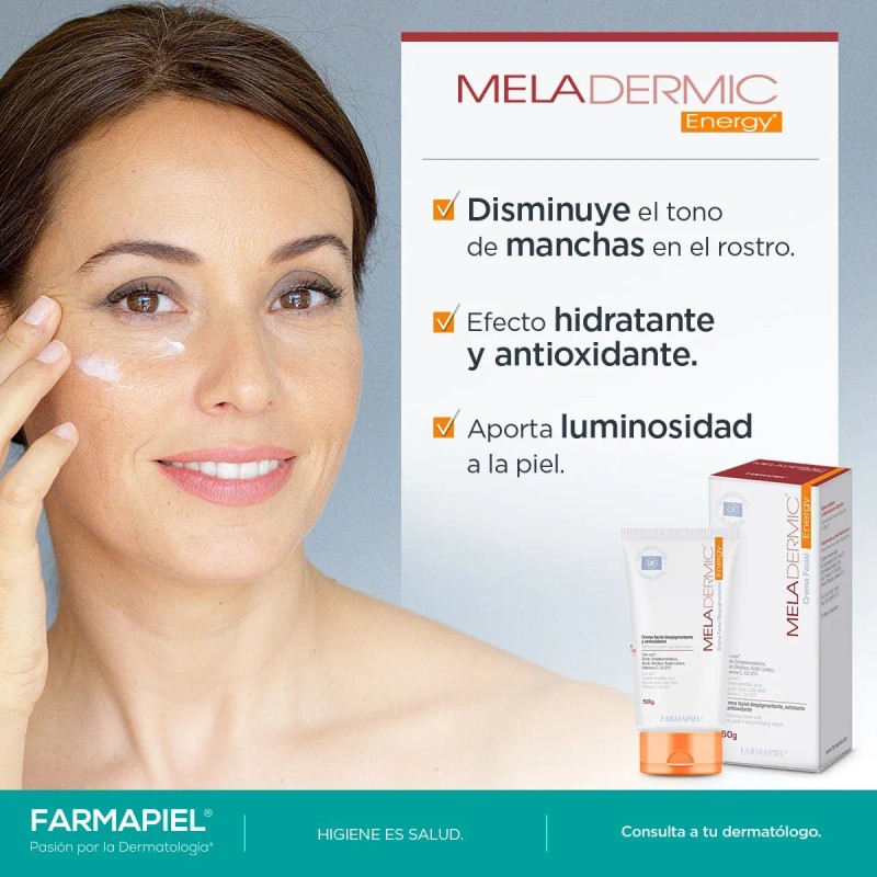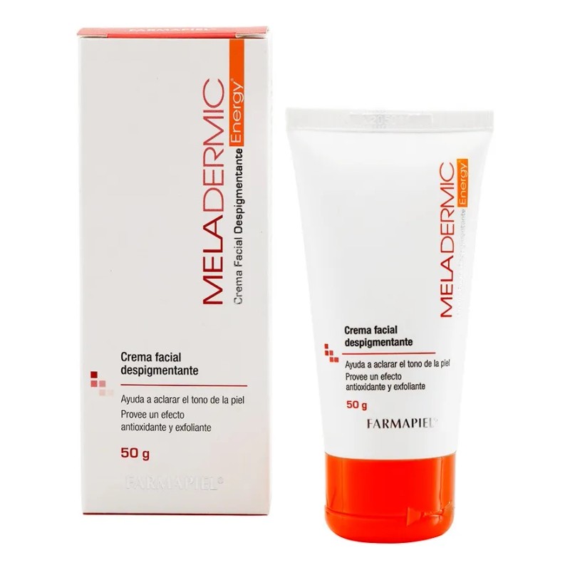 Unveil a brighter, more even complexion with Meladermic Energy, a powerful facial depigmenting cream designed to revitalize your skin. This 50g cream acts as a comprehensive solution for various skin concerns, offering significant benefits including its anti-aging properties, potent antioxidant action, and remarkable depigmenting capabilities. It actively works to lighten skin tone, reduce the appearance of common concerns like melasma ("paño"), dark spots, and freckles, while also providing a regenerating and exfoliating effect for smoother skin texture. Beyond its clarifying benefits, this cream deeply hydrates and moisturizes the skin, leaving it feeling soft and comfortable.