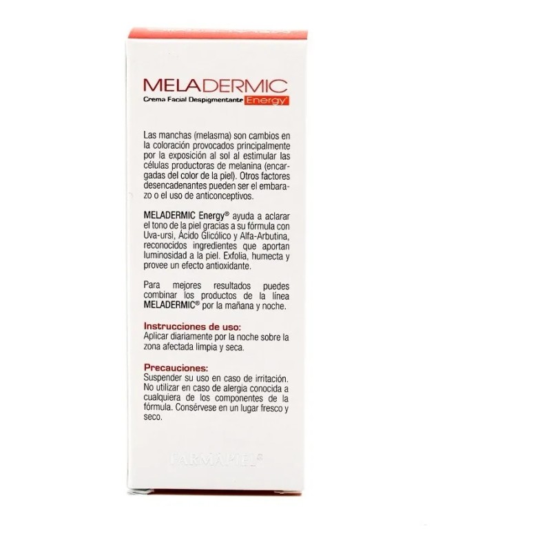 Meladermic Energy is a 50g facial depigmenting and brightening cream, formulated with Uva Ursi, Alpha-arbutin, and Vitamin C. It helps reduce dark spots, melasma, and freckles while offering anti-aging, antioxidant, regenerating, and hydrating benefits for a more even and radiant complexion.