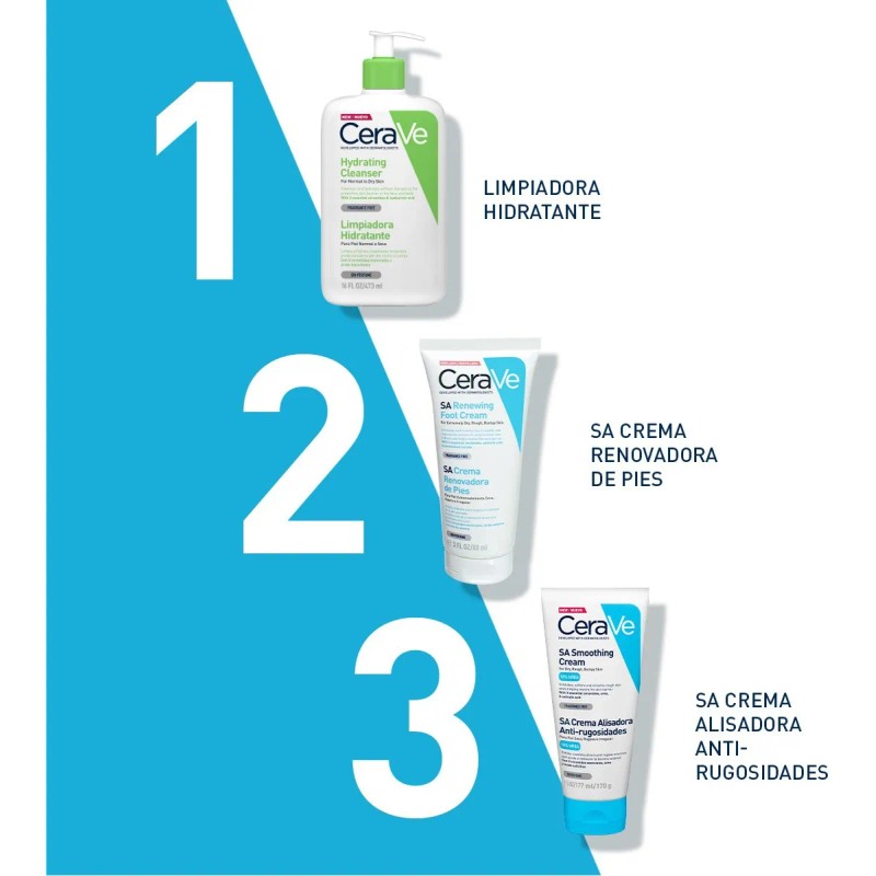 Descripción Limpia: La SA Crema Alisadora Anti-rugosidades de CeraVe contiene Urea, Ácido Salicílico y 3 ceramidas esenciales para exfoliar gentilmente la piel, mientras hidrata Y ayuda a restaurar la barrera cutánea.