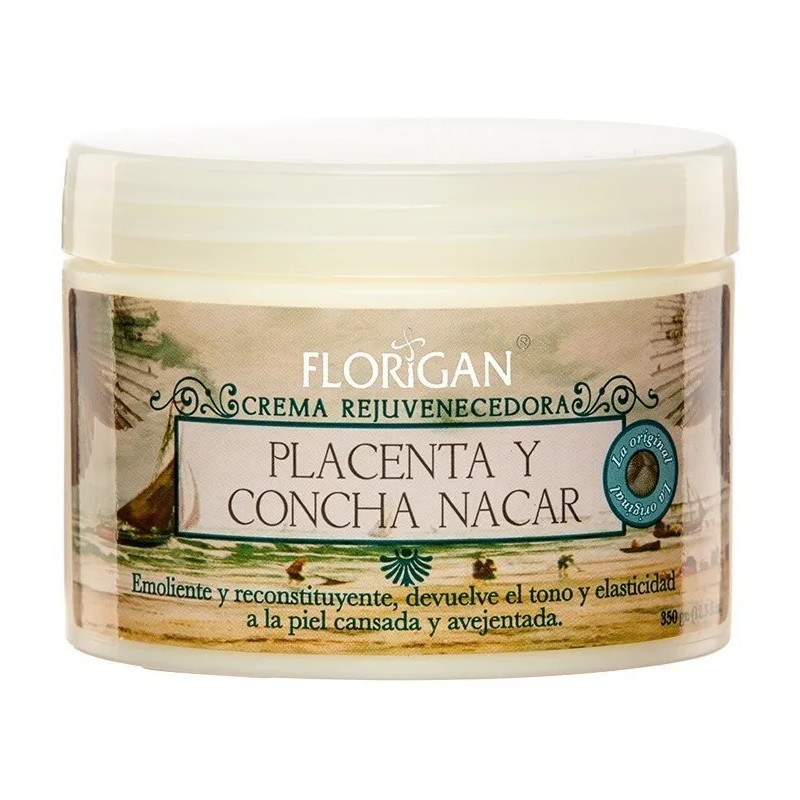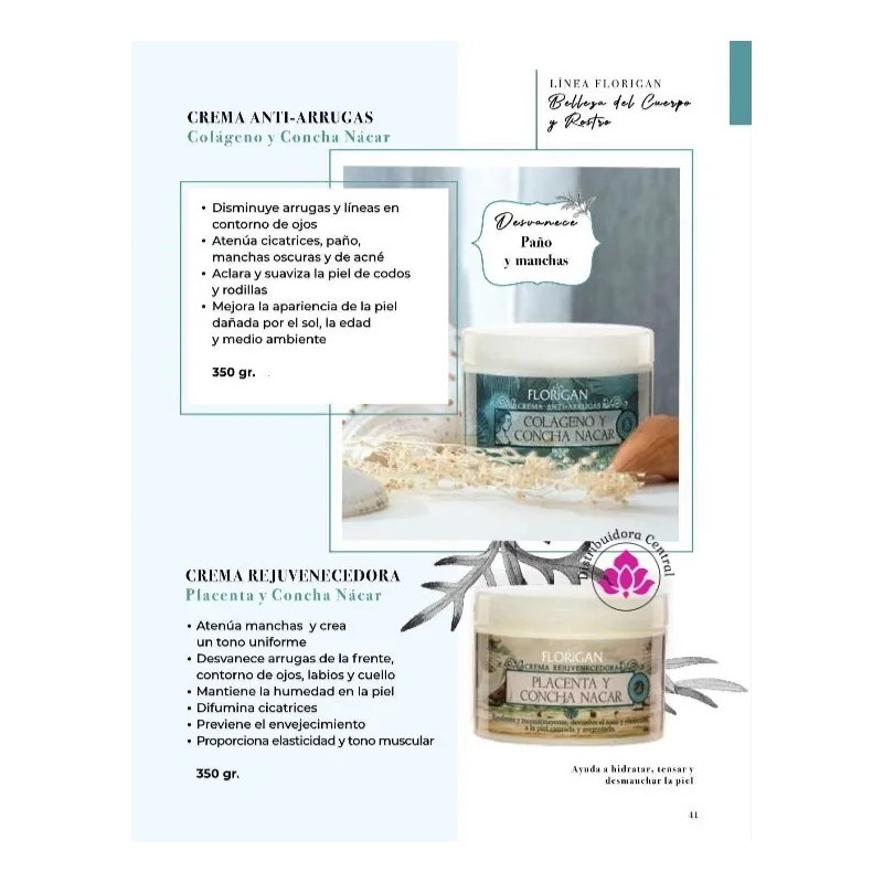 Crema Colágeno y Concha Nácar. El polvo extraído de la concha nácar ayuda a la regeneración y protección de la piel, el colágeno proporciona humedad y elasticidad y la placenta fortalece y elimina arrugas. Hidrata, tensa y desmancha. Ayuda a restablecer la piel de los daños producidos por el sol, la edad y el medio ambiente. Atenúa cicatrices, paños, manchas oscuras y espinillas. Aclara y alisa codos y rodillas. Produce una apariencia más joven. Florigan