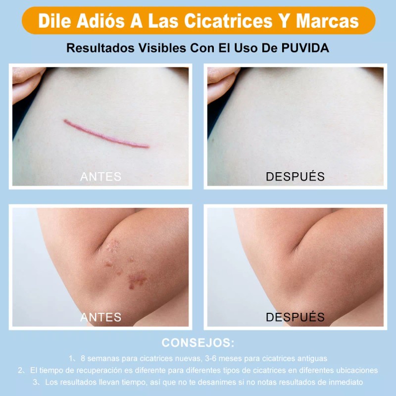 Reduce la visibilidad de cicatrices: Ayuda a minimizar la apariencia de cicatrices antiguas y nuevas, incluyendo las causadas por acné, cirugías, quemaduras o lesiones.