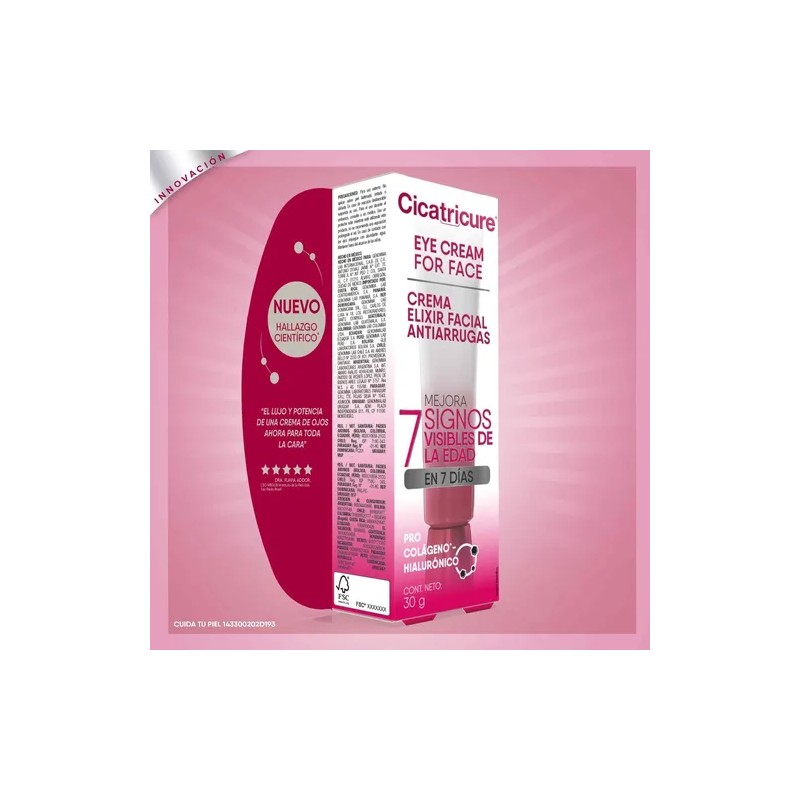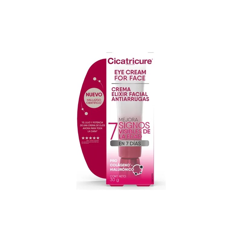 Cicatricure presenta una crema Elixir Facial anti arrugas que brinda la potencia de una crema de ojos para usar en toda la cara. Su exclusiva* combinación de ácido hialurónico, Péptidos y Vitaminas micronizadas que actúa en profundidad*, aumentando de inmediato un 31% la hidratación de la piel. En 7 días mejora los 7 signos visibles de la edad: