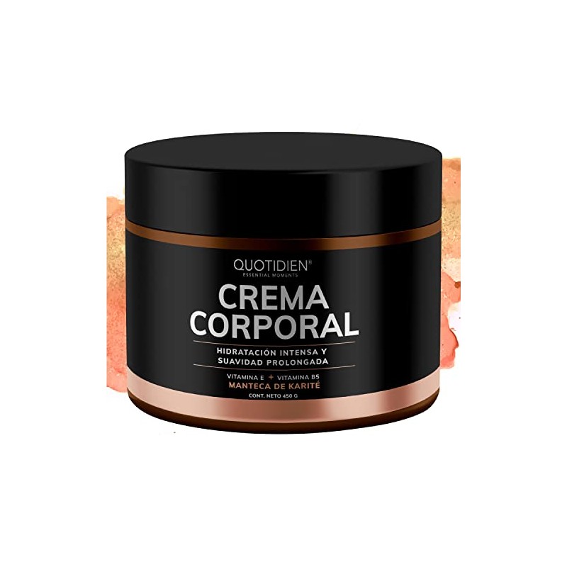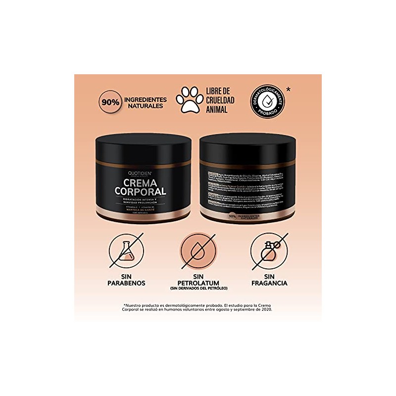Acerca de este artículo HUMECTACIÓN EXTREMA de ALTA CALIDAD: La Crema Corporal Quotidien fue diseñada para hidratar, dar suavidad y brillo a la piel de tu cuerpo. Ayudará a disminuir la irritación y resequedad, ayudando a tu piel a recuperar la humedad que necesita. Esta combinación de ingredientes naturales harán que tu piel mantenga una hidratación prolongada y le dará un toque aterciopelado único. 90 % INGREDIENTES NATURALES: Esta crema corporal hidratante ofrece todos los beneficios que la piel de tu cuerpo necesita. No contiene petrolatum ni derivados del petróleo. No contiene fragancias artificiales, colorantes ni parabenos. Renueva los niveles de humedad con Vitamina E+Vitamina B5 + Manteca de Karite. La piel de tu cuerpo se verá suave y brillante, y estará lista para comenzar o terminar el día. Producto libre de crueldad animal.