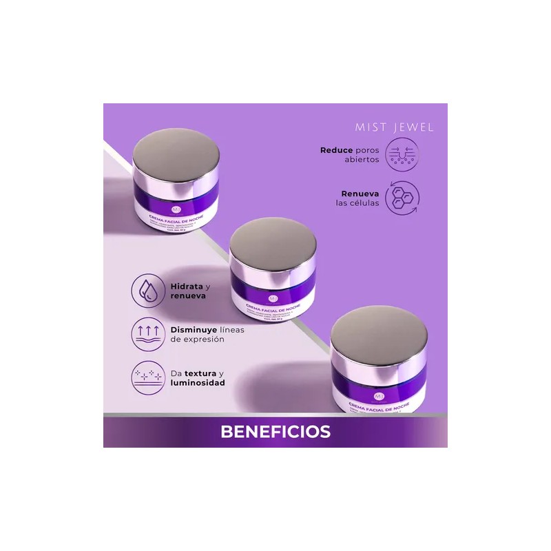 CARACTERÍSTICAS DEL PRODUCTO: Esta crema de noche facial es un potente hidratante y renovador de la piel. Ayuda a reducir las líneas de expresión y revitaliza el cutis, proporcionando elasticidad, firmeza y resistencia al rostro para un efecto reparador e iluminador.