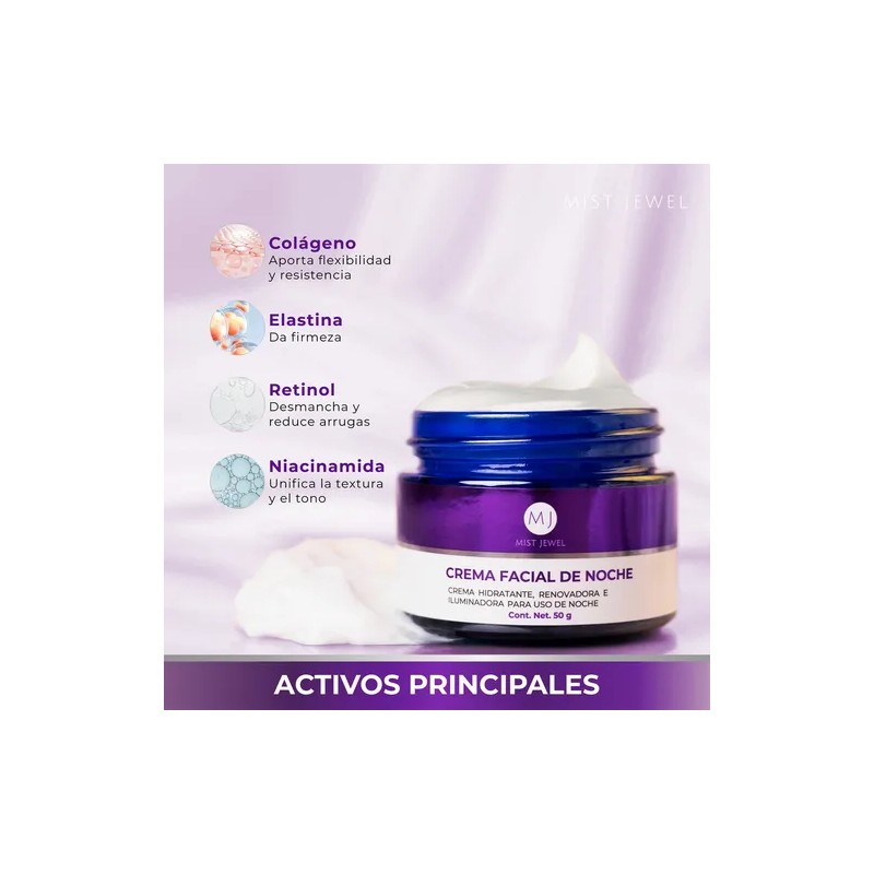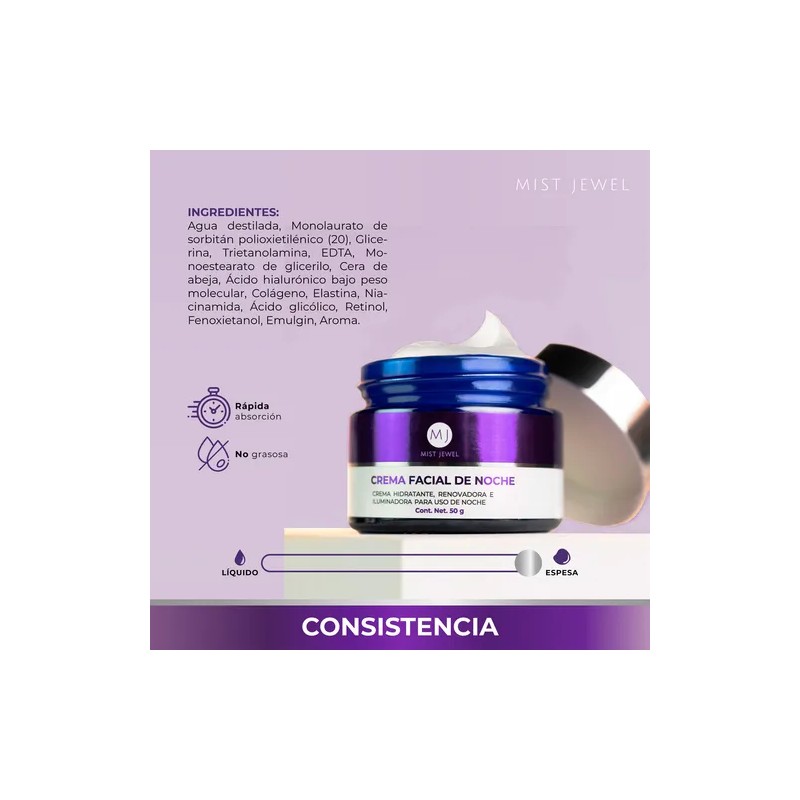 CARACTERÍSTICAS DEL PRODUCTO: Esta crema de noche facial es un potente hidratante y renovador de la piel. Ayuda a reducir las líneas de expresión y revitaliza el cutis, proporcionando elasticidad, firmeza y resistencia al rostro para un efecto reparador e iluminador.