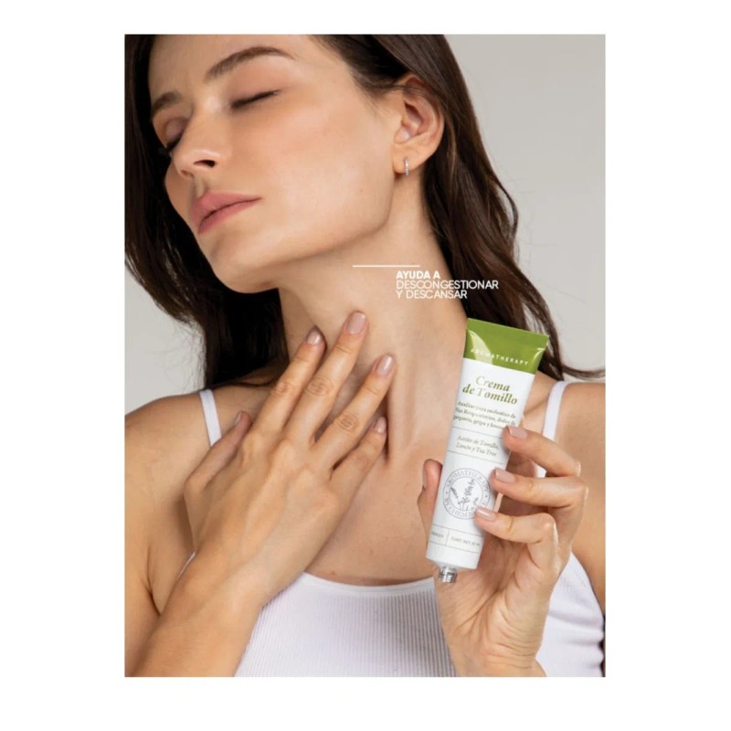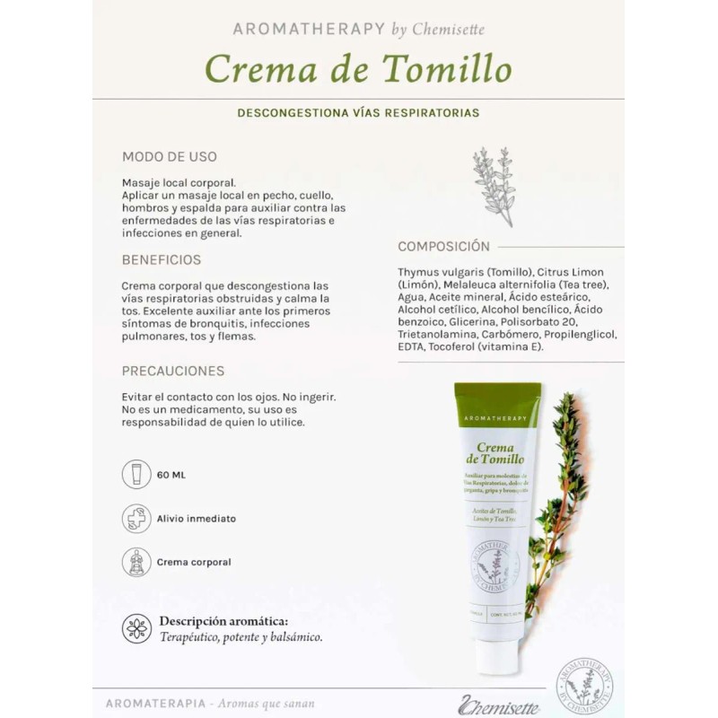 Descripción Limpia: La Crema De Tomillo Chemisette es una crema corporal diseñada para descongestionar las vías respiratorias y calmar la tos, ofreciendo un alivio inmediato con su potente y balsámico aroma terapéutico a tomillo. Ideal para todo tipo de piel, esta crema hipoalergénica se aplica en el cuerpo y proporciona un efecto refrescante que dura hasta 5 horas. Con una consistencia cremosa y un volumen de 60 mL, es perfecta para llevar en cualquier momento. Aunque no es una marca destacada ni TOM, Chemisette garantiza un producto nuevo y de alta calidad. Su envase en pasta facilita su aplicación, asegurando una experiencia revitalizante y calmante.
