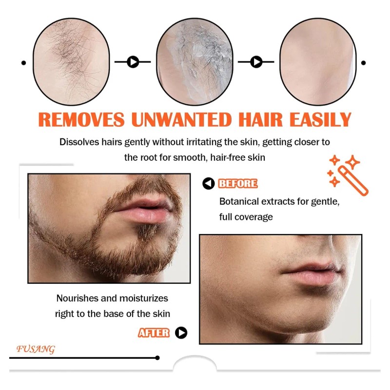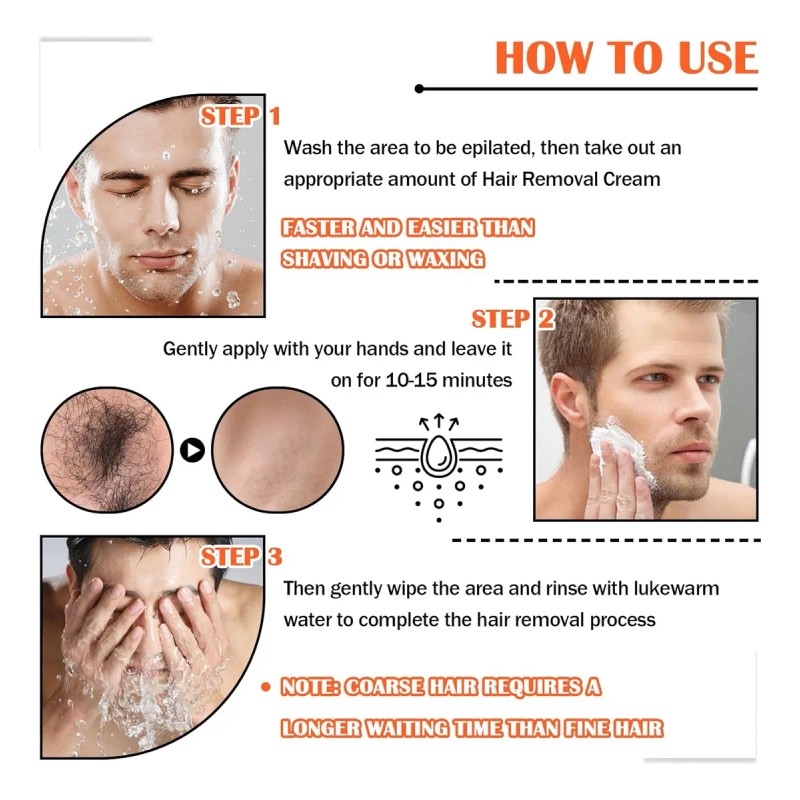 Ámbito de aplicaciónLa crema de depilación se puede utilizar en todo el cuerpo en áreas con vello no deseado y es una gran opción para hombres que quieren una apariencia hermosa y suave.; Textura sedada y refrescanteLa crema es sedada y cremosa, ligera y fácil de aplicar, con resultados deseables de larga duración que son muy agradables para la piel.; Adecuado para todo tipo de piel. La fórmula suave y de alta calidad es muy cómoda de usar y hace que sea una experiencia agradable de depilación, especialmente para hombres con cabello grueso.; DuraderaEsta crema depilatoria es tan eficaz que dura mucho tiempo, haciendo que tu glamour dure.; Fácil de usarLa crema depilatoria es un producto de depilación simple y práctico para hombres que te permite eliminar el vello en casa sin tener que gastar tiempo y dinero en la tienda.