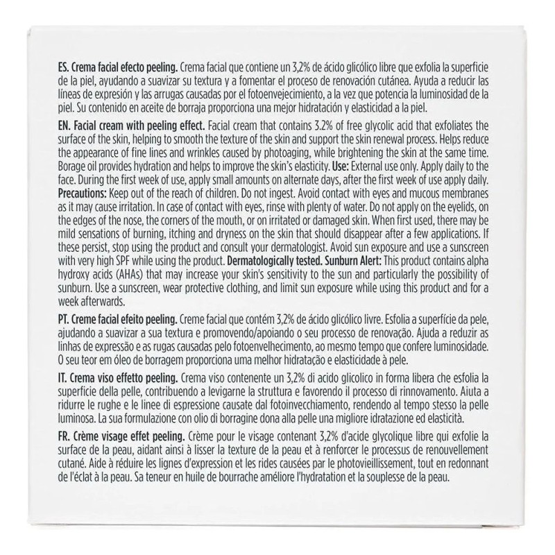 Ácido glicólico: formulado con un 8% de ácido glicólico parcialmente neutralizado (equivalente al 3,2% de glicólico libre). Aceite de borraja: promueve la elasticidad e hidratación de la piel. Fórmula libre de aceite. Probado dermatológicamente.