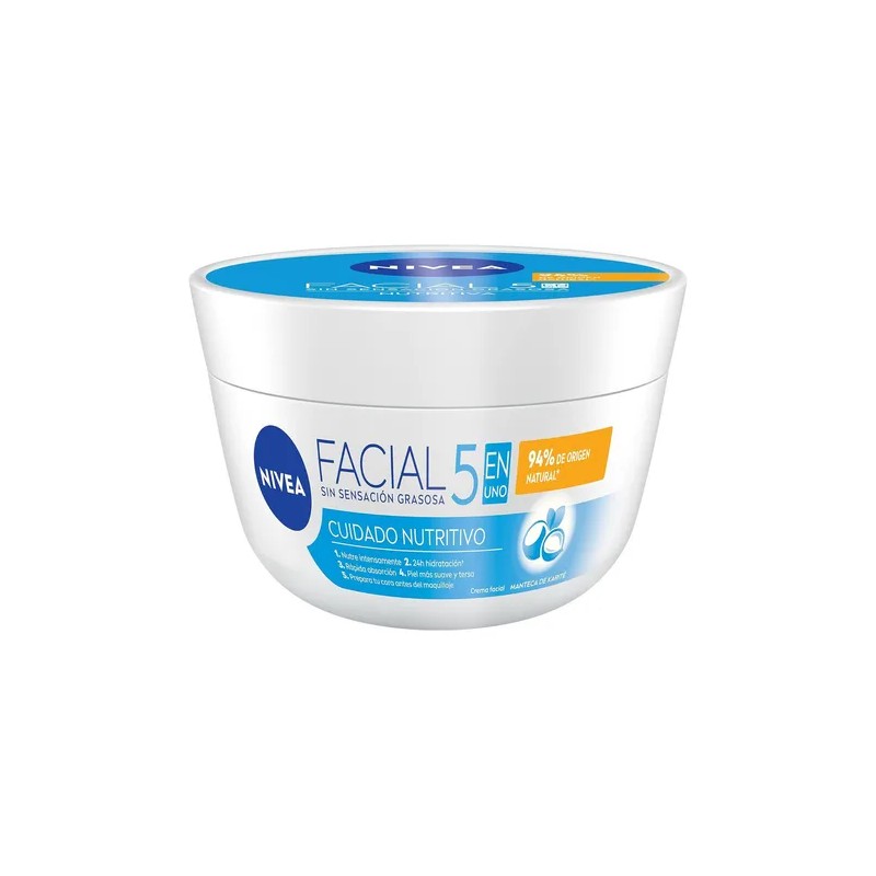 Con una fórmula de alta calidad libre de parabenos y alcohol, y con un 94% de sus ingredientes de origen natural, nuestra crema facial hidratante Nivea 5 en 1 Cuidado Nutritivo es la elección perfecta para una piel radiante y saludable. Dermatológicamente probada para un uso diario sin preocupaciones.