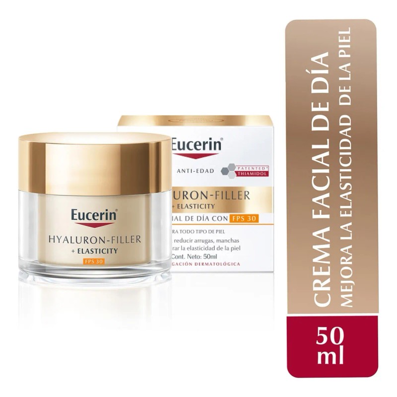 Descripción Limpia: Eucerin Hyaluron-Filler+Elasticity Crema facial para el cuidado de pieles maduras durante el día, con FPS 30 y protección UVA. Ayuda a fortalecer la estructura de la piel, mejora la elasticidad y tiene un efecto relleno antiarrugas.