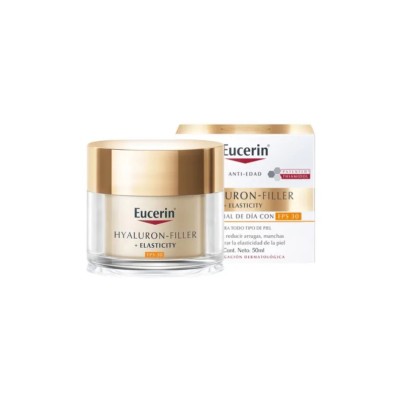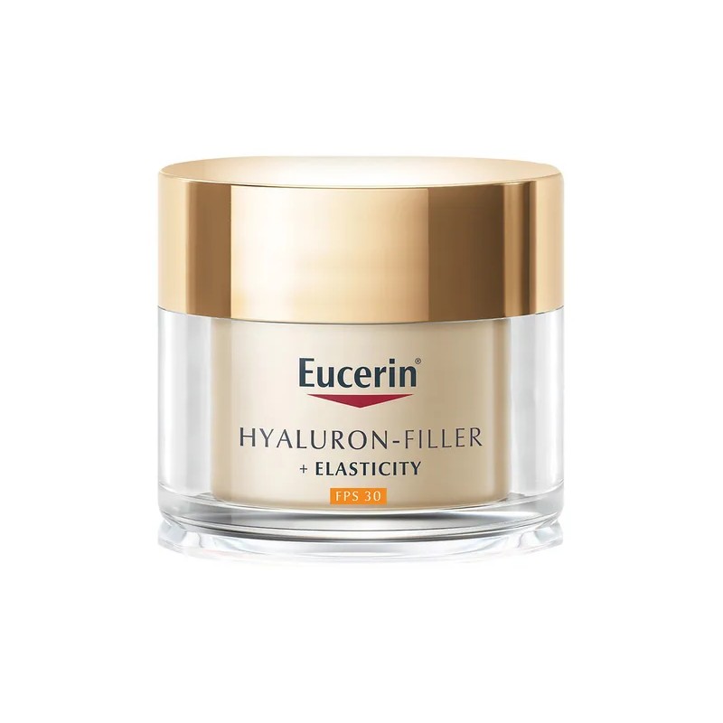 Eucerin Hyaluron-Filler+Elasticity Crema facial para el cuidado de pieles maduras durante el día, con FPS 30 y protección UVA. Ayuda a fortalecer la estructura de la piel, mejora la elasticidad y tiene un efecto relleno antiarrugas.