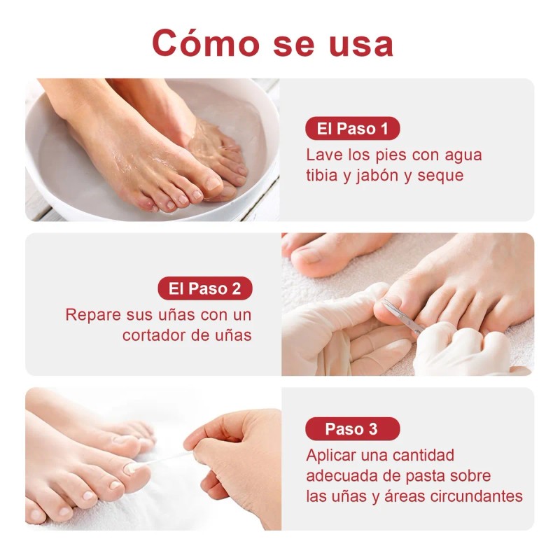 Lave y repare las uñas antes de usar. Aplique una cantidad adecuada de pasta sobre las uñas afectadas, así como sobre la piel circundante. Espere unos minutos para secar.