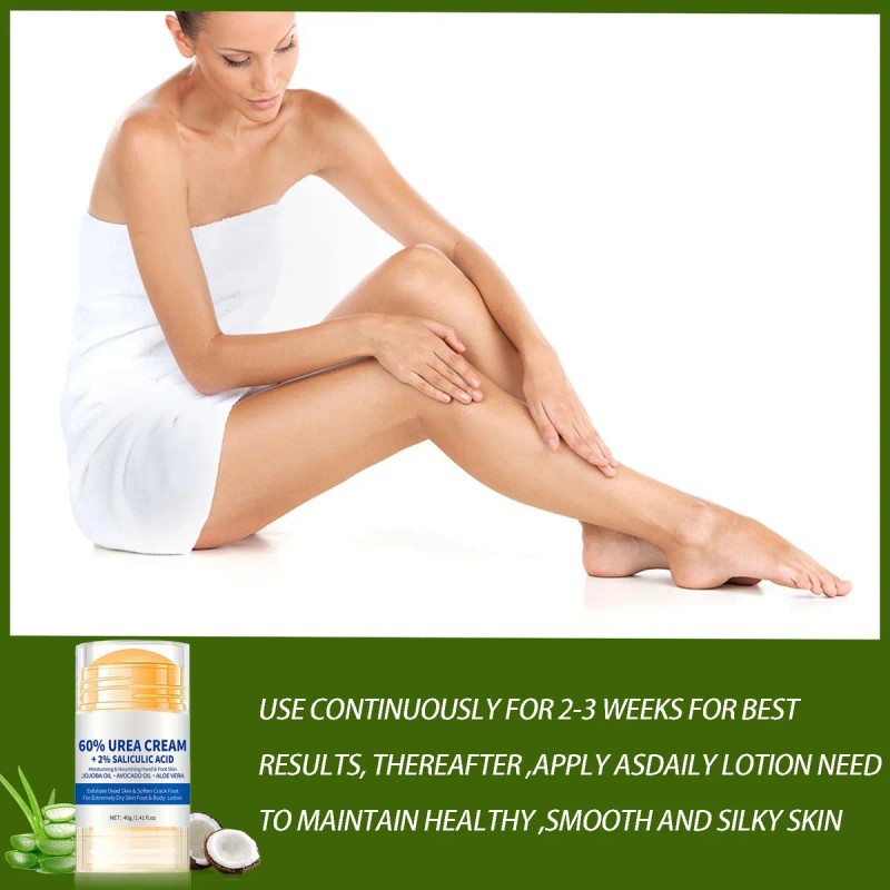 Our Urea Cream 60% with 2% Salicylic Acid deeply penetrates and hydrates dry, cracked skin. It softens calluses and rough patches, leaving your feet, hands, and knees feeling smooth and rejuvenated.