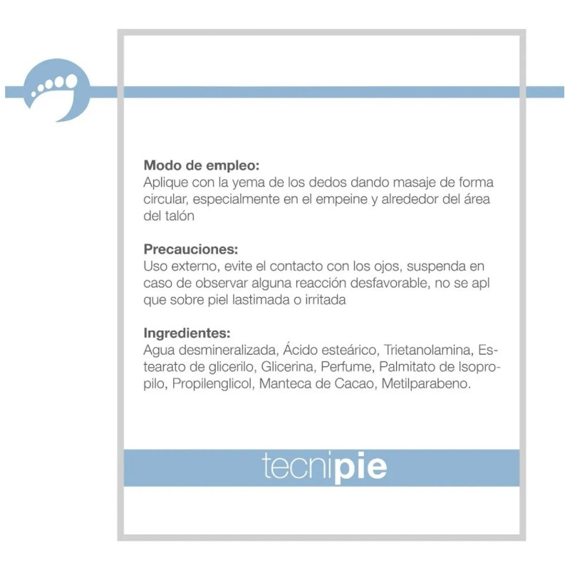 Descripción Limpia: Tecnipie Crema Humectante Para Pies es la solución al problema de la piel reseca con descamaciones y fisuras, proporcionando la suavidad y elasticidad perdidas. No es grasosa y está hecha a base de cacao, un producto natural muy hidratante que devuelve la humedad de la piel.