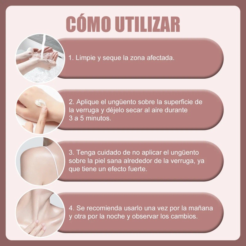 Instrucciones de uso: Limpia y seca bien la zona afectada, aplica una pequeña cantidad de crema sobre la verruga, y deja que se absorba completamente. Repite este proceso 2-3 veces al día hasta que la verruga desaparezca. Si notas alguna irritación, suspende el uso y consulta a un médico. 🩹