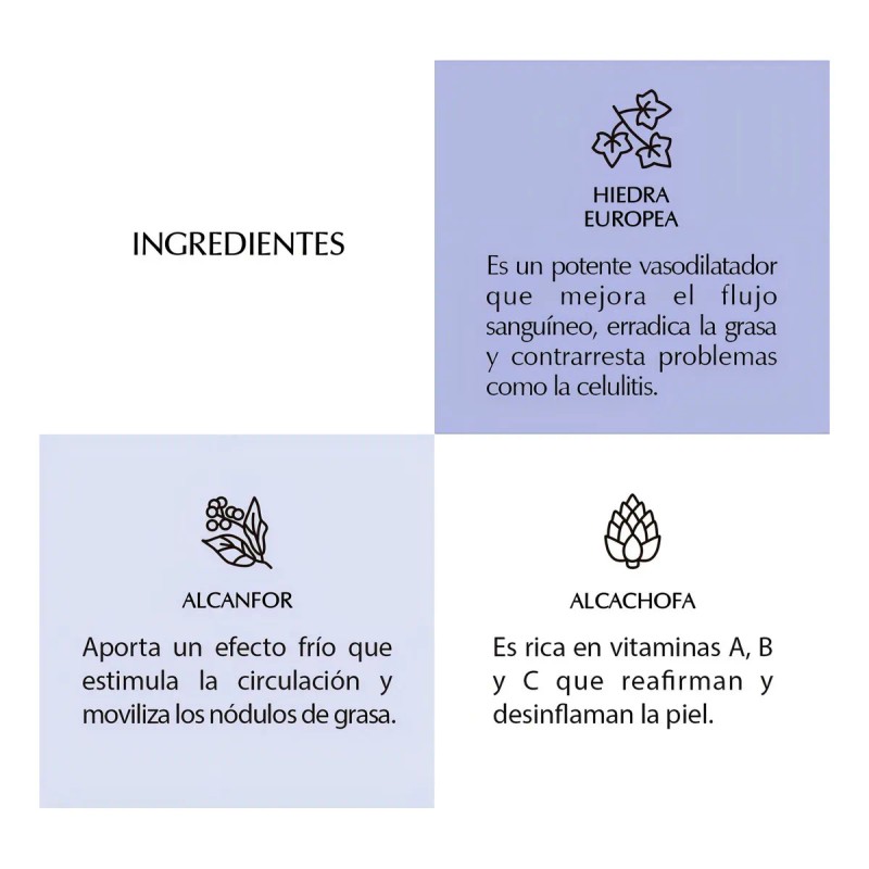Enriquecida con alcanfor, este activo natural estimula la microcirculación, favoreciendo la eliminación de grasa localizada y mejorando la apariencia de zonas con celulitis o flacidez. Su textura facilita el masaje y se absorbe rápidamente sin dejar sensación grasosa.