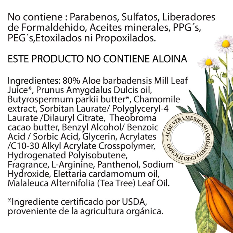 - Contiene 80% de Aloe vera ( Aloe barbadensis Mill.) puro, proveniente de cultivos mexicanos 100% orgánicos. Esta enriquecida con extracto de manzanilla, Manteca de Karité, aceite de almendras dulces, aceite de cardamomo, Aceite de hoja del árbol del té y manteca de semilla de cacao, siendo éste último un buen emoliente que ayuda a mantener la piel humectada.
