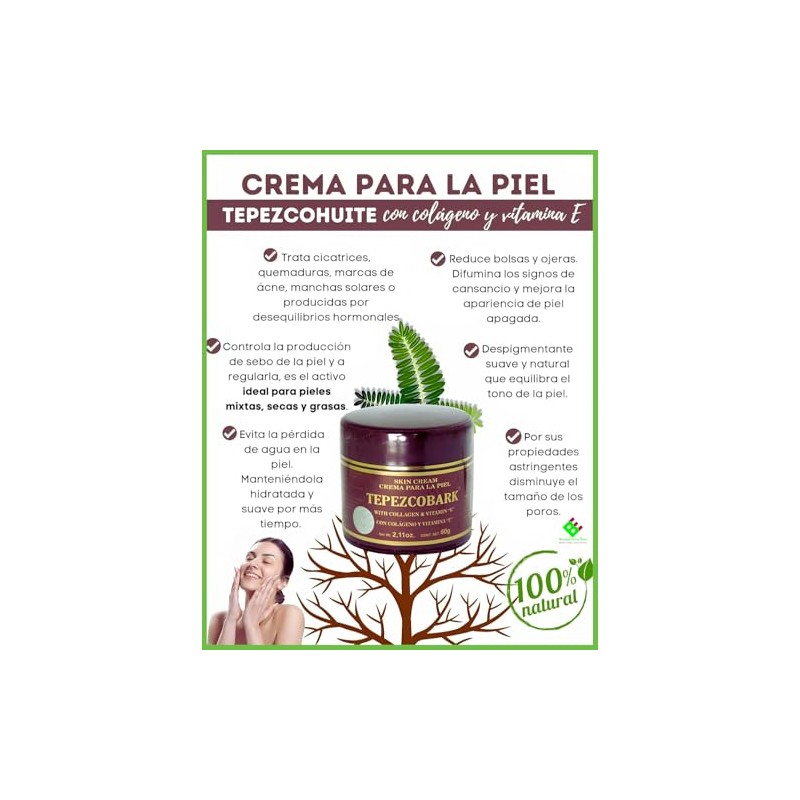 Crema Tepezcohuite (Tepezcobark) con colágeno y vitamina E - 2. 11 oz (60g) - 100% natural Revitaliza tu piel con el poder nutritivo de la crema Tepezcohuite, una mezcla única de tepezcobarca natural, colágeno y vitamina E. Esta fórmula 100% natural está diseñada para hidratar y mejorar la apariencia de todo tipo de piel. abordar una amplia gama de preocupaciones de la piel. Tepezcohuite se utiliza tradicionalmente para apoyar el proceso de renovación natural de la piel, mientras que el colágeno y la vitamina E trabajan juntos para mejorar la elasticidad y proporcionar una hidratación duradera. Ideal para el uso diario, esta crema deja tu piel suave, tersa y fresca. Beneficios: Revitalización natural de la piel: La corteza de Tepezcohuite, conocida por sus propiedades regenerativas, ayuda a nutrir y apoyar la renovación natural de la piel.