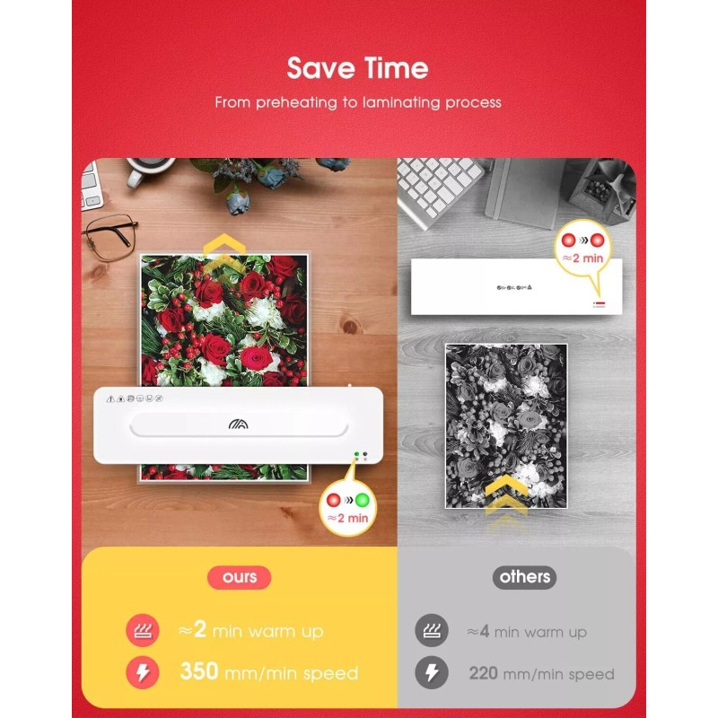 - 【Instant Preheat and Laminate】 The laminator does not just have approx. 2min rapid warm-up, but also features a lightning speed of 350mm/min. It dramatically increases your work efficiency.