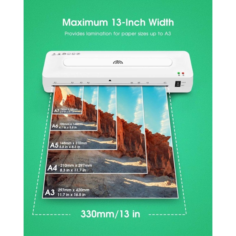 - 【13-Inch Wide Inlet】 This laminating machine fits for different paper materials up to A3 size, including label, bookmark, card, certificate, painting, menu, providing long-lasting protection.